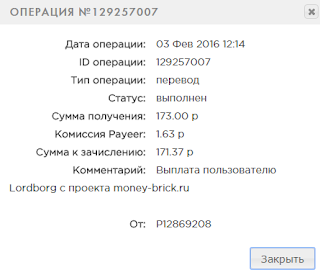 Комментарий: Выплата пользователю monhyip с проекта money-brick.ru