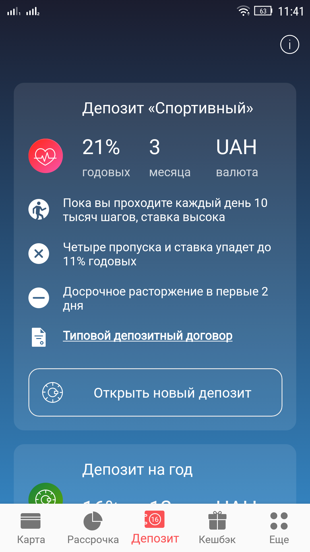Депозит "Спортивный" в новом обновлении. Ставки в 21% если вы проходите 10 000 шагов в день.