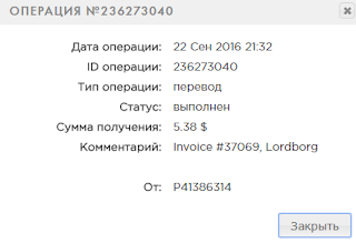 The amount of 5.44 USD has been deposited to your Perfect Money account. Accounts: U12340510->U96хххх. Memo: API Payment. Invoice 37139, Allcool.. Date: 20:32 22.09.16. Batch: 147455570.