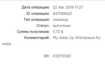 Спасибо!The amount of 4.89 USD has been deposited to your account. Accounts: U13918904->U194****. Memo: My Adds Up Withdrawal. Date: 03:19 12.08.19. Batch: 275704540.