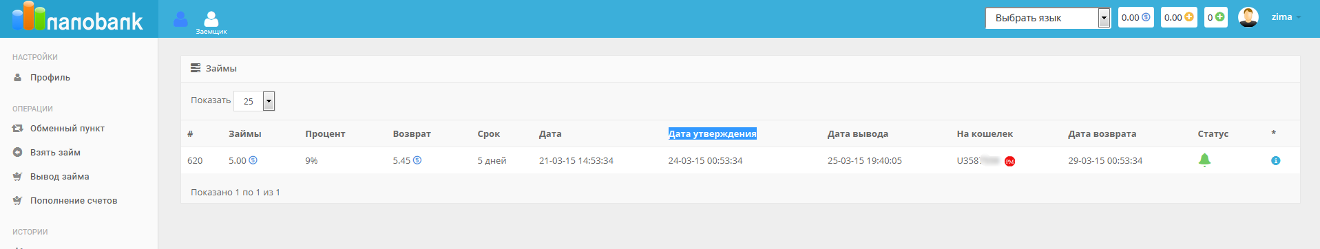 в разделе ЗАЁМЩИК жму ВЫВОД ЗАЙМА и там нажимаю ВЫВОД кошелёк там вписан уже сумма 5 ЕСТЬ!