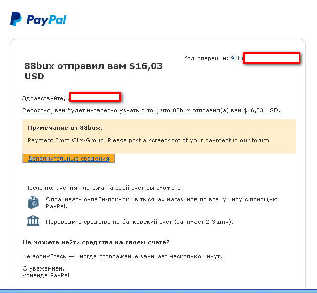 88bux только что отправил(-а) вам $18,46 USD с помощью PayPal
