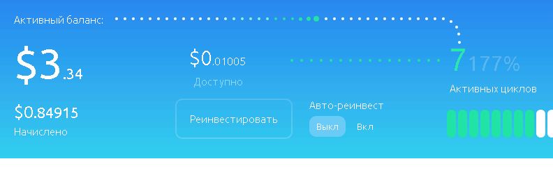 Купил на 5-6 баксов, а накапало всего 70 центов на остаток. Сейчас 3,34 активного баланса. 7 циклов (280%) показывает, то есть это сколько должно пройти дней, чтобы получить 10,01 бакса?