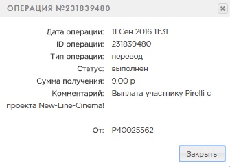 Комментарий: Выплата участнику Pirelli с проекта New-Line-Cinema!