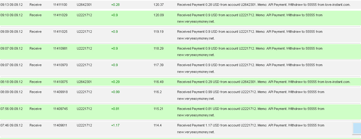 The amount of 0.9 USD has been deposited to your Perfect Money account. Memo: API Payment. Withdraw to G***from new.veryeasymoney.net.. Date: 08:28 09.09.12. Batch: 11410249.