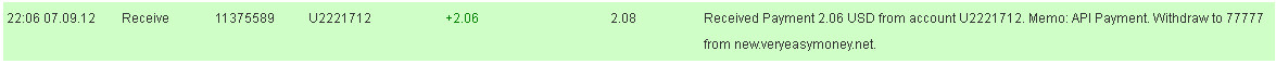 08.09.12 03:15 Receive Received Payment 2.25 USD from account U2221712 to account U...... Batch: 11379542. Memo: API Payment. Withdraw to 77777 from new.veryeasymoney.net.