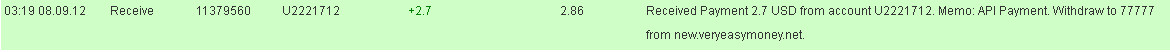 08.09.12 03:19 Receive Received Payment 2.7 USD from account U2221712 to account U....... Batch: 11379560. Memo: API Payment. Withdraw to 77777 from new.veryeasymoney.net.