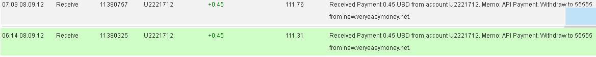 06:14 08.09.12 Receive 11380325 U2221712 +0.45 111.31 Received Payment 0.45 USD from account U2221712. Memo: API Payment. Withdraw to 55555 from new.veryeasymoney.net.