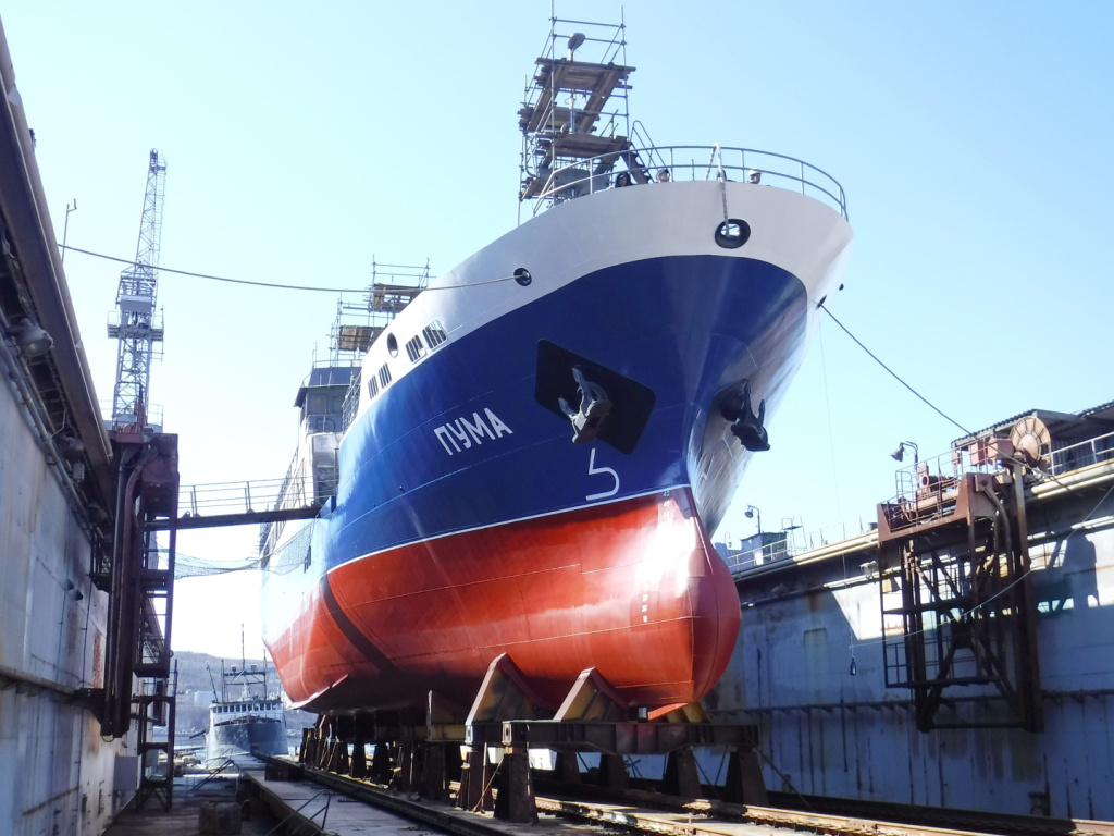 На судостроительном заводе «Восточная верфь» (Приморский край) спущено на воду пятое судно-краболов «Пума» проекта 03141 .