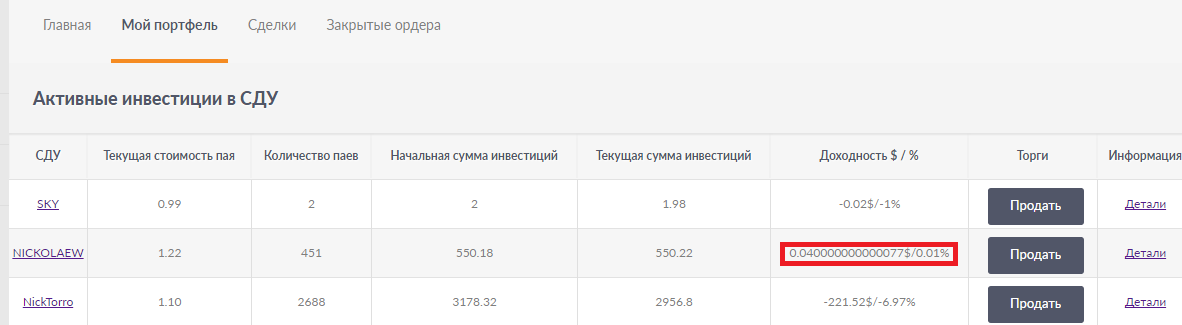 Купил долей, потом продал все кроме одной и получил доходность -99.9% процентов :)