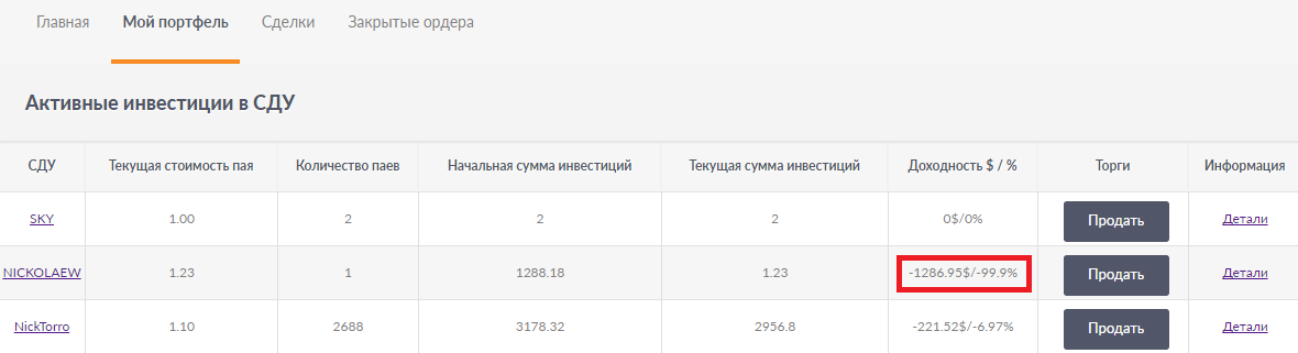 Выставил в стакане Николаева лимитник на покупку по 1.23, поменял на 1.1, его исполнили (????). Теперь у меня в таблице активных инвестиций в Николаева стоит начальная сумма почему-то 135,2. Ну и сдоходностью, соответсвенно, какая-то лажа