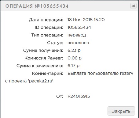 Комментарий: Выплата пользователю rezerv с проекта 'paceka2.ru'