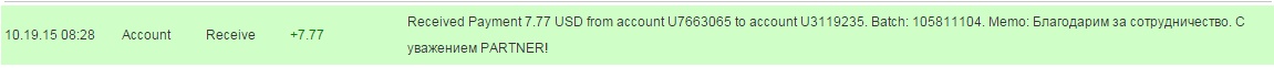 10.12.15 13:07 Account Receive +7.89 Received Payment 7.89 USD from account U7663065 to account U19***. Batch: 105044789. Memo: Благодарим за сотрудничество. С уважением PARTNER!
