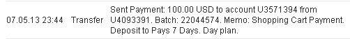 05.07.13 13:26 Account Receive +0.58 Received Payment 0.58 USD from account U3571394 to account U3ххххххх. Memo: API Payment. Withdraw 1 of 80 from Pays 7 Days.
