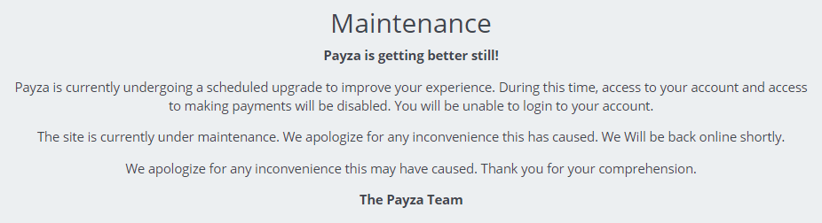 Payza is currently undergoing a scheduled upgrade to improve your experience. During this time, access to your account and access to making payments will be disabled. You will be unable to login to your account.