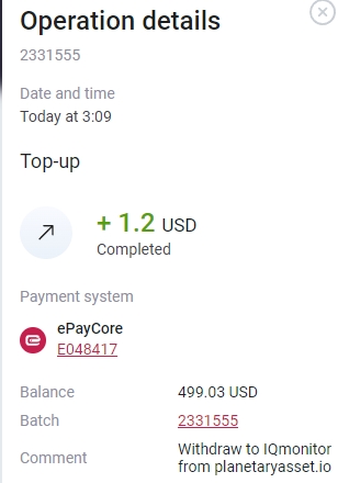 Saturday, February 10, 2024 9:29 AM - 1.80 USD: Operation ID: 2336680 Operation Date: 10.02.2024 09:29 Status: Completed Sender's account: ePayCore E048417 Amount: 1.8 USD Note: Withdraw to InstantMonitorCom from planetaryasset.io
