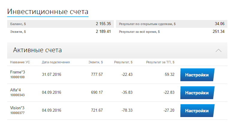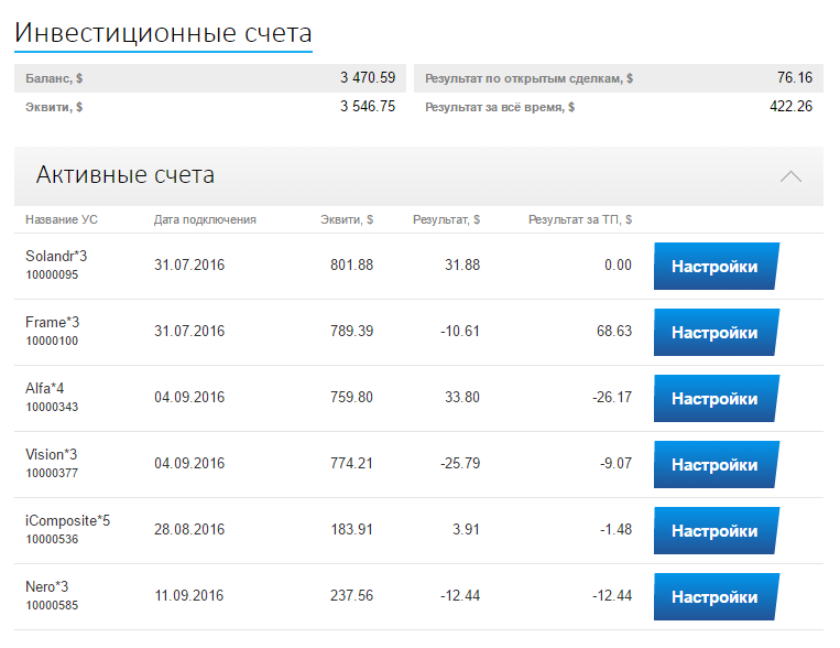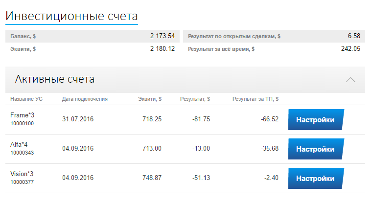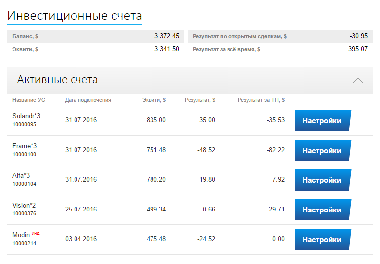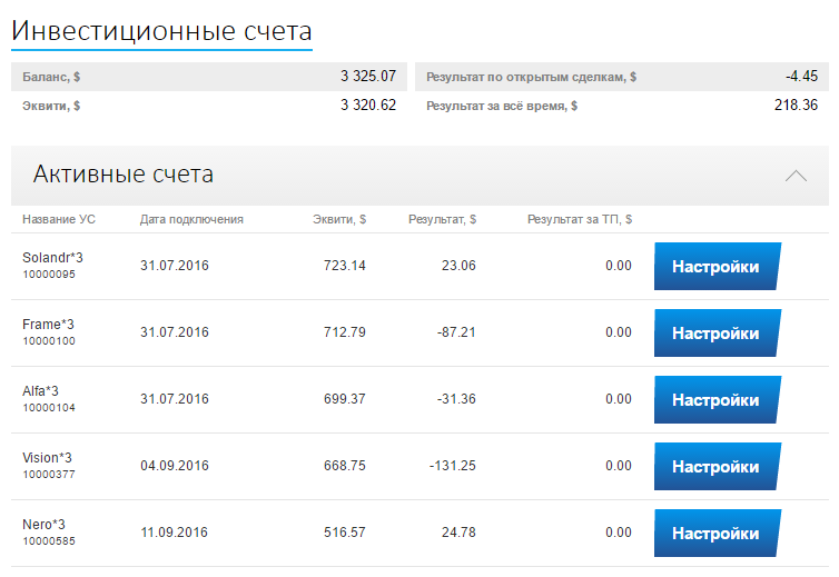 По нескольким выбранным УС наблюдается плавающая просадка, что является нормой и находится в пределах нормы. Напомню, что все инвестиционные результаты, как и личный кабинет, исчисляются по Эквити (с учетом открытых сделок). Поэтому закрыв все счета, я бы получил результат -70$, но управляющие вместе с автоматической системой риск-менеджмента контролируют этот процесс. Поэтому ждем удачных входов и разворот тренда по открытым сделкам.