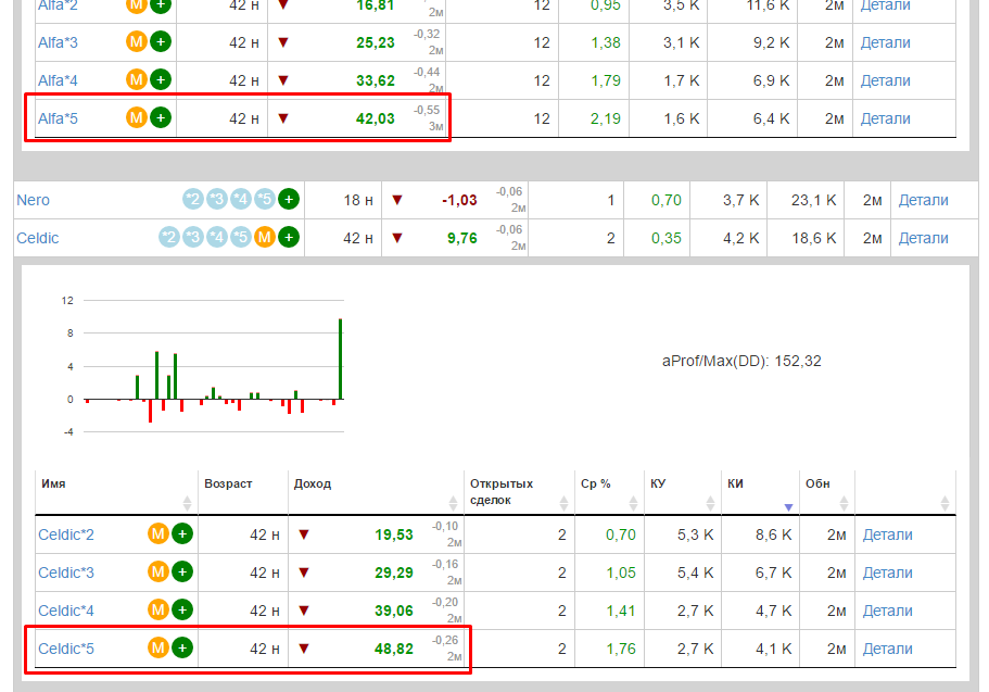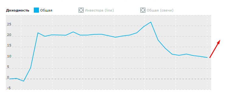 Но! Когда движение тренда положительное для сделки, то практикуется во многих счетах добор лота. Итого можем иметь кучу сделок в течении даже месяца-двух с суммарным убытком 5%, а потом благоприятный тренд с добором лота и прибылью 10-20%. Поэтому графики данных счетов для обычных инвесторов непривычны. Они привыкли видеть восходящую доходность за которой в 99% случае скрывает скрытый большой риск, что со временем обычно и происходит - СЛИВ. А здесь уже инвестирование не является понедельным. Все результаты следует анализировать в долгосроке