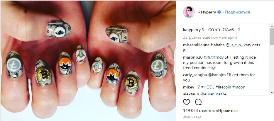Популярная американская певица Кэти Перри сделала маникюр с символами топовых криптовалют и соответствующее фото выложила на своей страничке в социальной сети Instagram.