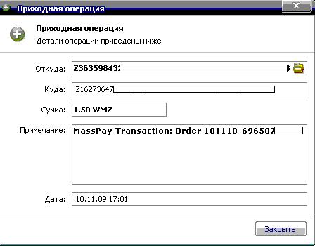 17:03 10.11.09 Receive 1567495 U2391*** +2.5 Received Payment 2.5 USD from account U2391***. Memo: Shopping Cart Payment. Order 101110-65033297-58. Payment ID: 101110-65033297-58