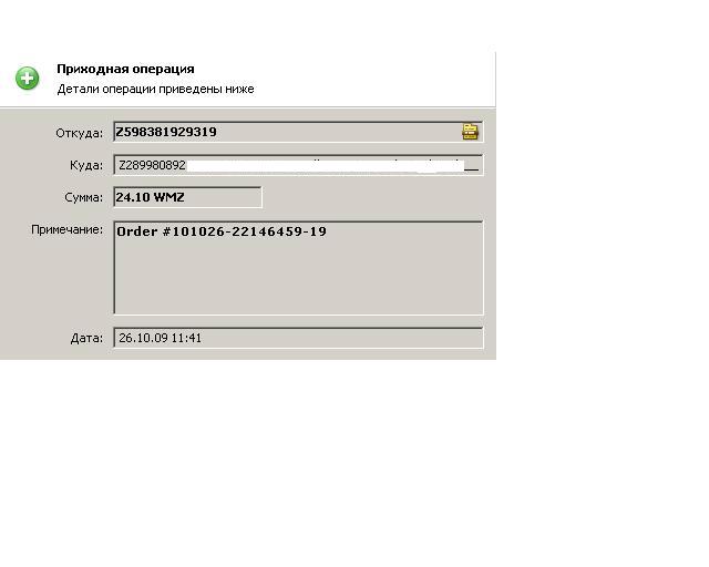 26.10.09 14:30 Receive Received Payment 2.34 USD from account U2391760 to account U1848ХХХ. Batch: 1505352. Memo: Shopping Cart Payment. Order 101026-78515157-93.