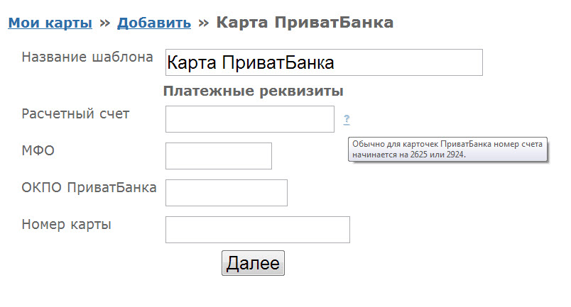 В указанном поле рекомендуем указывать расчётный счёт банка, а именно 29244825509100. Также в поле МФО: 305299 и ОКПО: 14360570 которые можно найти по ссылке http://privatbank.ua/about/contacts/ или в Приват24 в меню: Мои реквизиты.