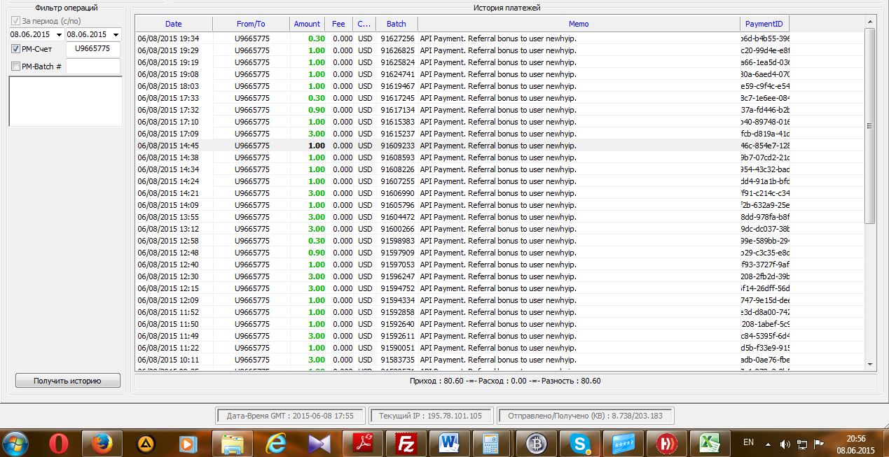08.06.15 20:19 Transfer Sent Payment: 10.00 USD to account U9665775 from U275****. Batch: 91631220. Memo: Shopping Cart Payment.