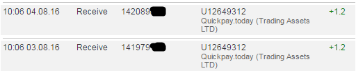 Quickpay.today (Trading Assets LTD) +1.00 Received Payment 1.00 USD from account U12649312. Memo: API Payment. 6633 1060.