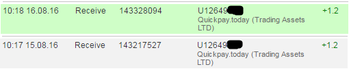 08:08 16.08.16 Receive 143316850 U12649312 Quickpay.today (Trading Assets LTD) +3.00 Received Payment 3.00 USD from account U12649312.