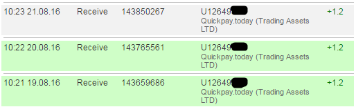 08:11 21.08.16 Receive 143841489 U12649312 Quickpay.today (Trading Assets LTD) +3.00 Received Payment 3.00 USD from account U12649312.