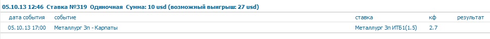 Надо было ТБ брать, а я поверил в хозяев, день города всеобщий праздник, Карпаты тоже не очень. Самое время побеждать. Ну и два гола Запорожья смотрелось нормально за такой Кф. Карпаты один закинут, ну и Запорожье два забьёт. Ура победа и т.д. и т.п. Не рассчитал, что они полные инвалиды. Хоть за гол спасибо, ТБ в конкурсе зашло.
