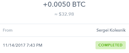 Your transaction is on the way!You sent0.0050 BTC(UAH876.92)