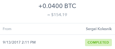 Sergei Kolesnik just sent you 0.0120 BTC (worth $47.85 USD) using Coinbase.