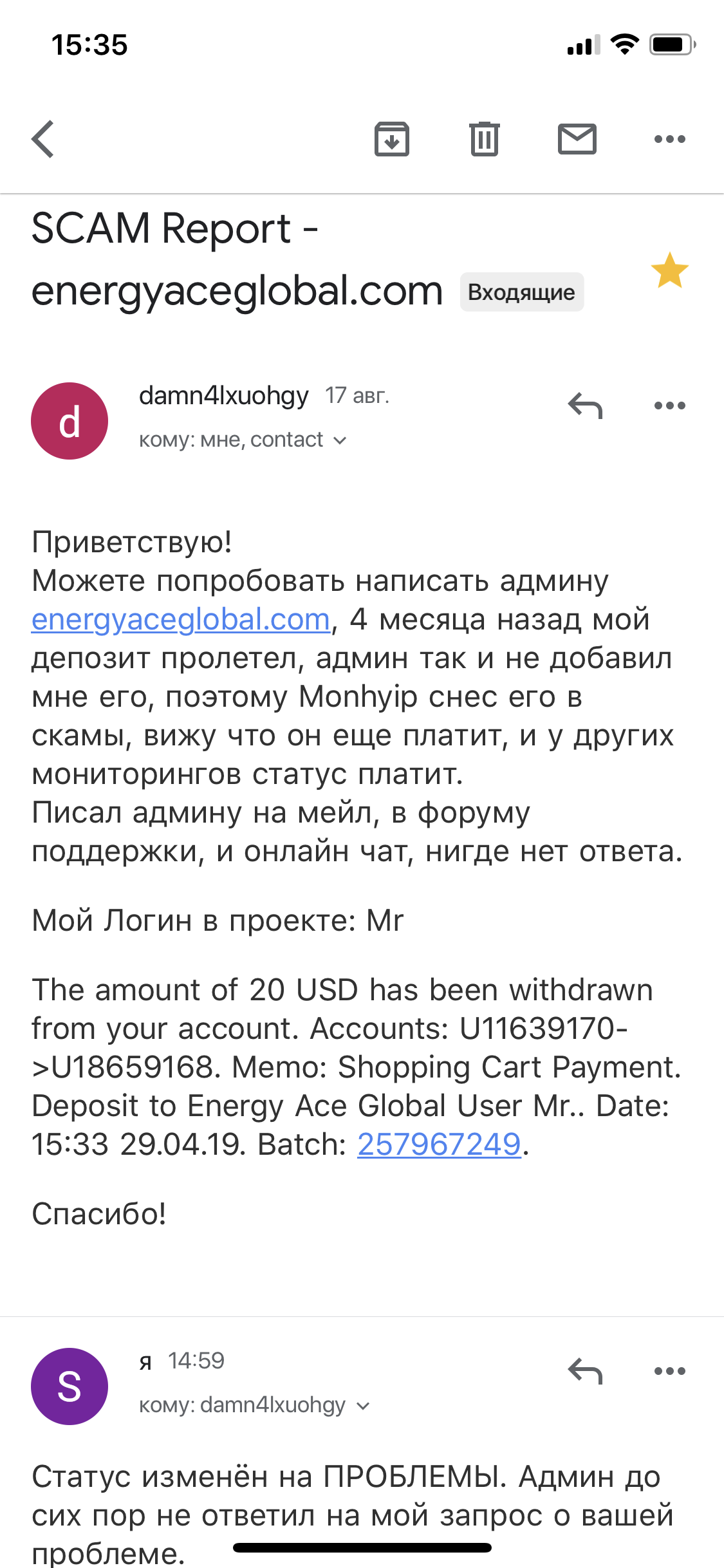 Прошло больше 24 часов после моих сообщений двум мониторам по скаму energyaceglobal.com. :cowboy: