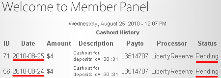 61 2010-08-24 $2 Cashout for deposits id# :18 u87***** LibertyReserve Pending