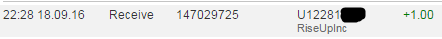 09.20.16 10:48 Account Receive +6.00 Received Payment 6.00 USD from account U12281109 to account U4731311. Batch: 147176121. Memo: API Payment. Auto. RiseUP