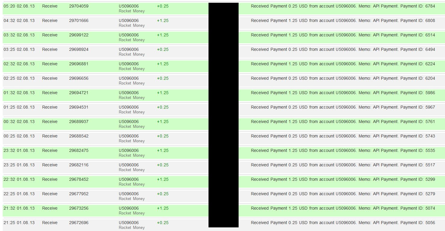 04:18 02.08.13 Receive 29701220 U5096006 Rocket Money +1.25 11.9 Received Payment 1.25 USD from account U5096006. Memo: API Payment. Payment ID: 6725