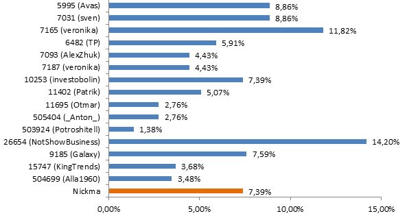 кстати, на эту неделю тоже увеличил его долю в 2.5 раза. Надеюсь, будет нас и дальше доходностью радовать.Решил увеличить долю счета 26654 (NotShowBusiness)