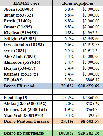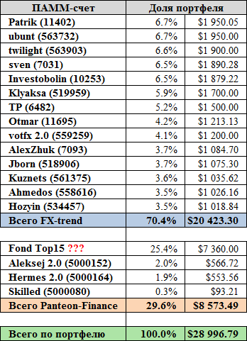• на ПФ я, наконец-то, вошел почти всеми средствами в ПАММ-фонд Top15 Акционный, остались средства в счетах Aleksej 2.0 (5000152) и Hermes 2.0 (5000164), которые будут выведены через неделю, по завершении ТП и, скорее всего, распределены между Mad Wolf (5002970) и Jakov Fetisov (5003680).