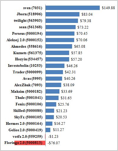 Еще одним из центральных событий стала неадекватная торговля Floringo, который умудрился одной сделкой просадить более 30% счета, при этом убыточная сделка по золоту был открыта на 300 лотов (!), при том что ранее более 30 лотов золота в одной сделке управ не открывал. Что это было? ошибка? или осознанный риск? В любом случае доверие к управляющему существенно подорвано, подозреваю, что изрядно похудевший КИ еще уменьшится по окончании текущего ТП.