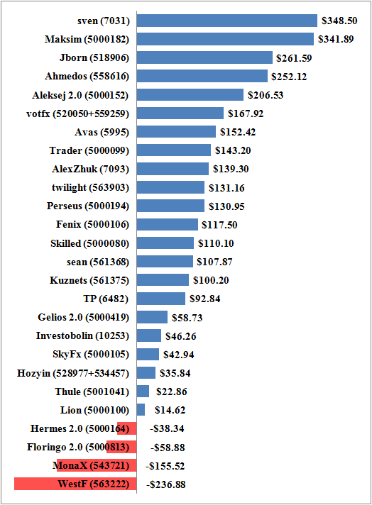 Прошедшая неделя в целом принесла хороший результат, однако исключительно стараниями трейдерами fx-trend. Результат Пантеоновской части портфеля равен нулю, в первую очередь усилиями Гермеса, который уже не первый раз в последнее время огорчает - третья убыточная неделя за 6 последних недель.