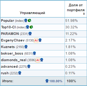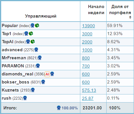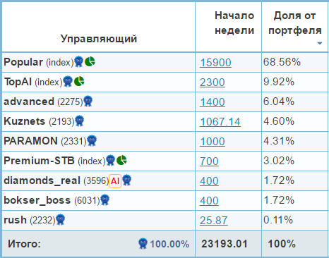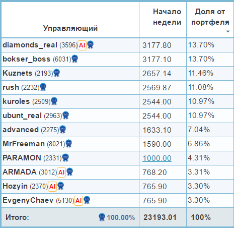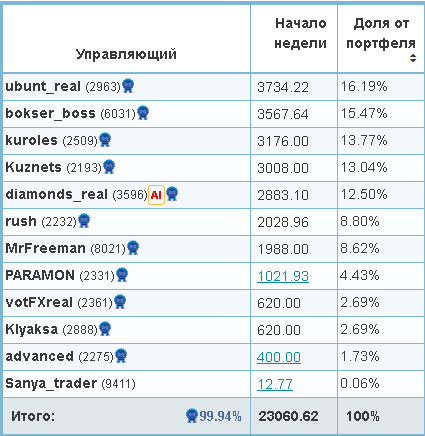 Неделя таки показала хороший всплеск рынков и на мое удивление все управы справились с этим испытанием на отлично. Боксер немного поволновал, но благодаря своим коротким стопам риски были под контролем. Парамон таки дал плюсик, но учитывая прошлые -50% и отсутствие КУ это очень мало. Лентяй. В отличии от него Кузнец побаловал инвесторов прибылью в 3,5%, что уже на площадке просто мечта, а не прибыль. Диамондс тоже накинула с премией +1,83%. В целом неделя очень хорошая.