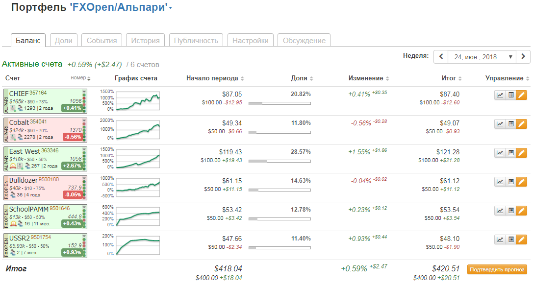 Новый pamm пока не добавляла решила посмотреть как будет работать в июне именно этот портфель. Результаты неплохие в итоге за период в три недели такие результаты: