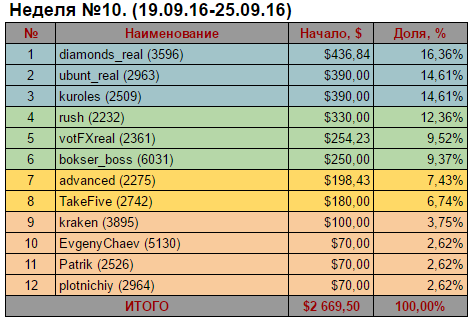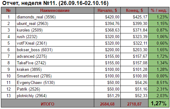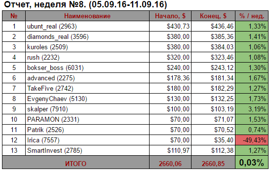 Отчет по прошедшей неделе. Что-то сентябрь не радует инвесторов профитом. Вторая неделя получилась скомканной, на фоне небольшой просадки Даймондс, другие трейдеры не показывают предыдущей своей доходности. Но главное - мы в зеленой зоне.