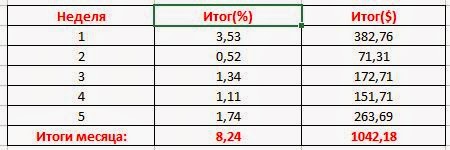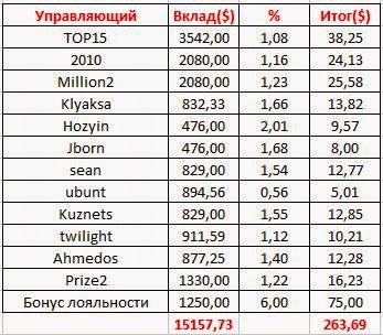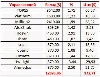 Ключевая задача на текущий год была – достичь капитала в $10k за счет инвестирования, различных акций и бонусов, доливок свободных средств. Она была выполнена с лихвой. На текущий момент капитал свыше $15k. Чистая прибыль за год составила около $6k. Доход без реинвестирования более 75% годовых, с реинвестированием более 95% годовых. Средний процент в неделю более 1,4%. Более 92% недель были положительные, кроме того со 2 июня не было ни одной убыточной недели, что составляет практически 7 месяцев.