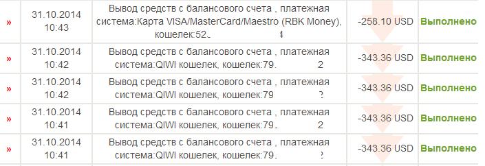 Информирую о поступлении на КИВИ кошелек всех 4х заявок, оформленных к выводу 31.10.2014. Заявка через РБК была "выполнена" 31го же, но деньги на карту пока не поступали (думаю, что вопрос в выходных днях).