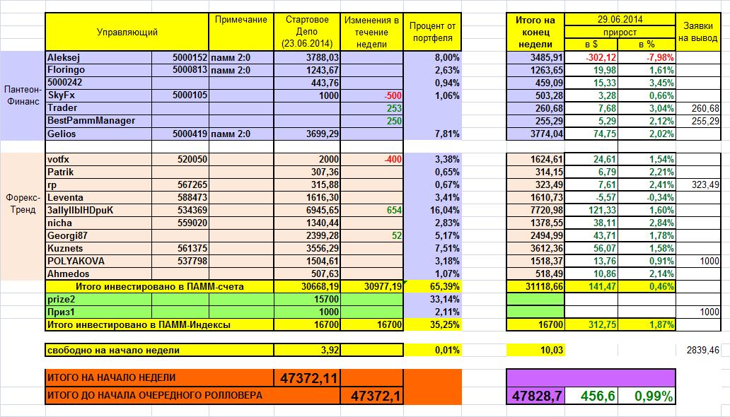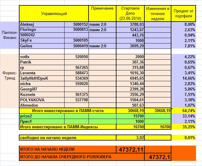 23.06.2014 - 29.06.2014: +456,6$/+0,99% от портфеля !