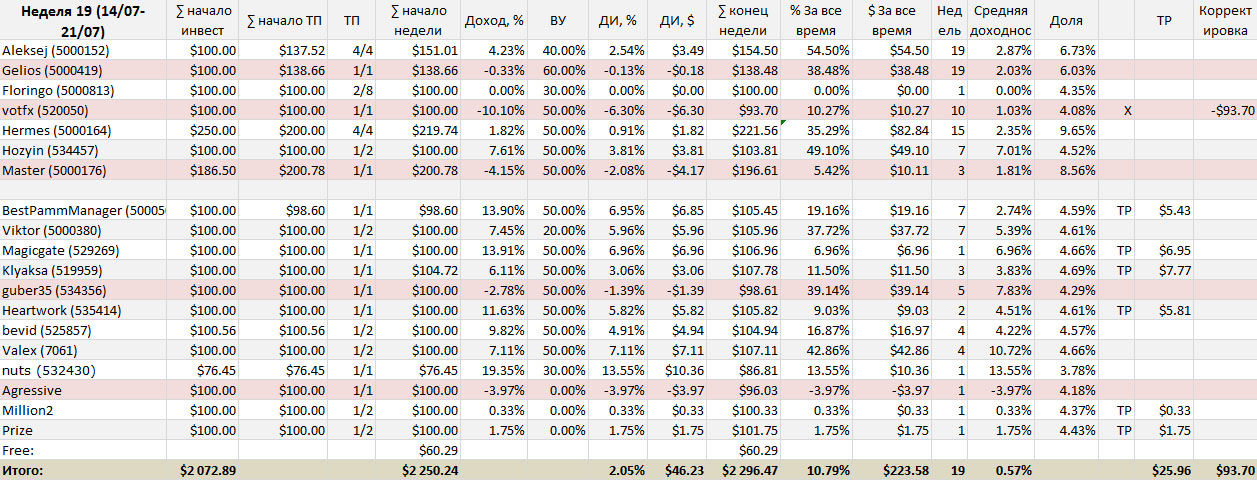 Сотыгу я долил лишь в середине недели, ее не конфисковали, и я ее закинул управляющему Heartwork (535414). Управляющий добивается хорошей доходности довольно скромными лотами, имеет ТП 1 неделю и штраф на выход всего лишь 20%. В общем, он мне симпатичен)