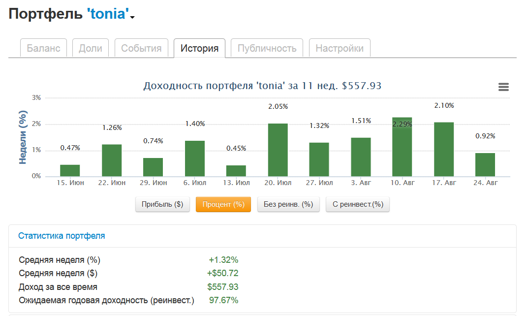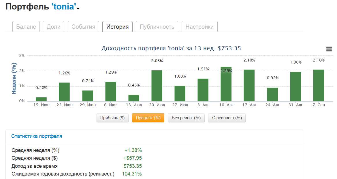Приветствую! Благодарю за проявленный интерес и положительную оценку портфеля! По расчетам сервиса investflow, на сегодняшний день (28.08.14) ожидаемая годовая доходность (реинвест.) = 97,67%. Надеюсь, что прогноз оправдается. Программа максимум, это 100% годовых.