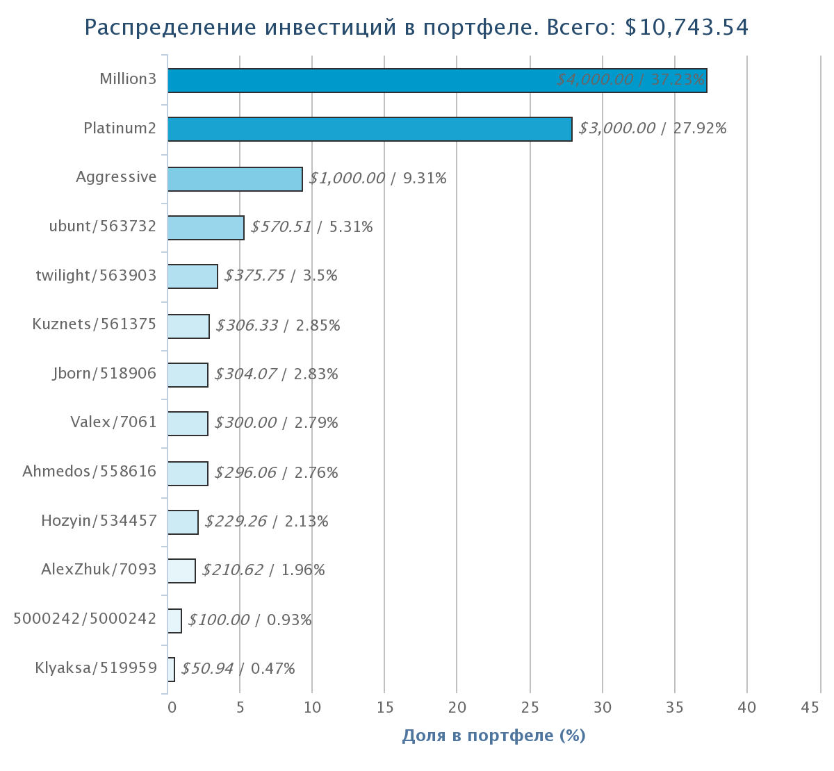 Сегодня днем вывел досрочно из управляющего AlexZhuk из-за плавающей просадки (-7.70%), радует маленький неснижаемый остаток инвестиций, всего 20%. Сразу купил на 300$ индекс Prize2.